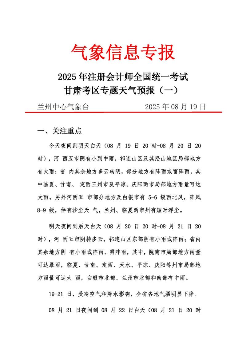 【2025 年08 月19 日】2025 年注册会计师全国统一考试甘肃考区专题天气预报(一)